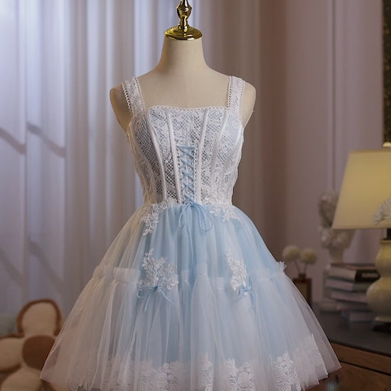 This light blue homecoming dress blends delicate charm with a touch of vintage elegance. The fitted lace corset bodice with structured boning and lace-up detailing offers a flattering silhouette, while wide lace straps add support and femininity. The flared layered tulle skirt is decorated with dainty bow accents and lace embroidery, creating a soft, romantic look. Available with adjustable straps or off-shoulder styling, the lace-up back ensures a perfect fit for any figure.