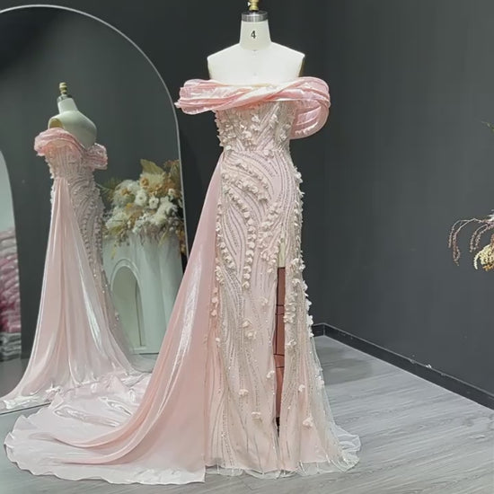 Blush Pink Off-Shoulder Beaded Evening Gown with 3D Floral Appliqué, High Slit & Draped Train – 26022