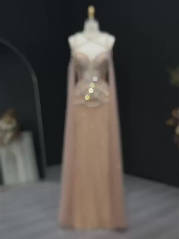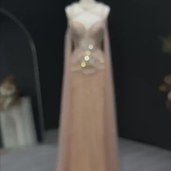 Champagne Beaded Sheath Evening Gown with Illusion Crisscross Neckline, Open Back & Cape Panels – 26038