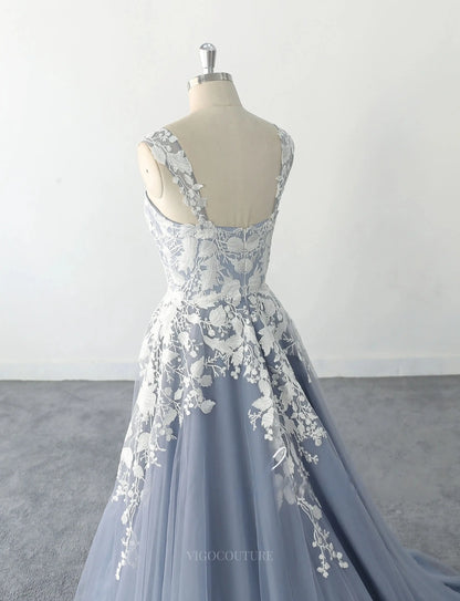 Grey Lace Tulle Wedding Dresses with Sweetheart Neckline, Spaghetti Straps & Chapel Train - MQ022