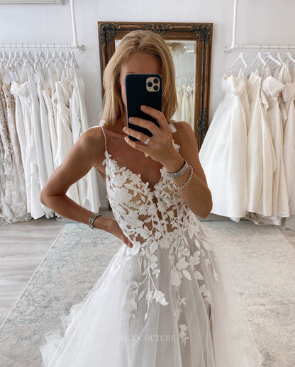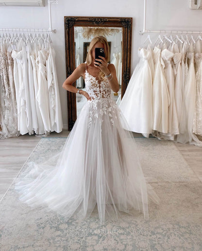 Ivory Lace Applique V-Neck Wedding Dress Spaghetti Strap Bridal Gown W0116