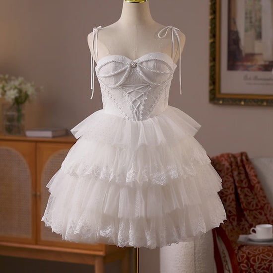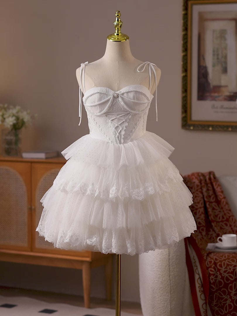 This ivory lace homecoming dress combines timeless elegance with playful charm. The fitted corset bodice is decorated with delicate pearl embellishments and a vintage-inspired jewel centerpiece, creating a regal touch. Slim tie straps add a dainty detail while ensuring a secure fit. The voluminous tiered tulle skirt with lace edging and dotted layers brings a flirty, romantic finish. A classic lace-up back completes the look with both comfort and adjustability.