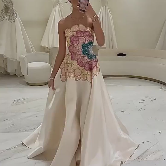 Ivory butterfly beaded evening gown featuring a strapless sweetheart neckline with elegant sheer beaded long sleeves. This formal satin gown showcases a butterfly-inspired crystal embroidery bodice with multicolor beadwork in blush, pink, and subtle teal accents, creating a couture, artistic effect. The sparkly hand-beaded bodice flows into a smooth ivory satin A-line skirt for a refined, timeless silhouette.