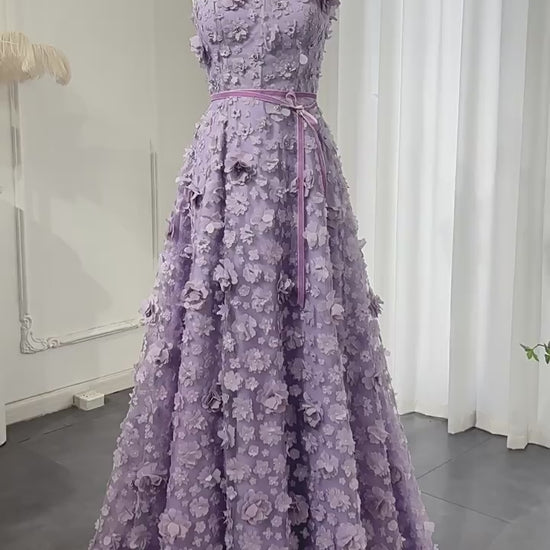 This lavender 3D floral evening gown features a romantic square neckline and a softly structured A-line silhouette, crafted in delicate tulle fabric adorned with dimensional 3D floral appliqué throughout. The fitted bodice is detailed with elegant floral straps and finished with a refined lace-up corset back for adjustable support and shape. A subtle ribbon waist tie highlights the waistline, while the floor-length floral skirt flows gracefully, making this lavender formal evening gown ideal for formal events, evening galas, garden receptions, and romantic celebrations.