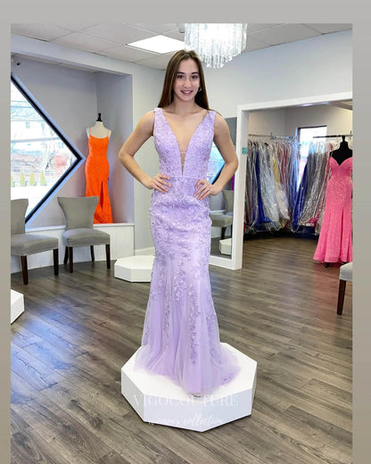 Lavender Lace Applique Prom Dresses Mermaid Plunging V-Neck Evening Dress 21872