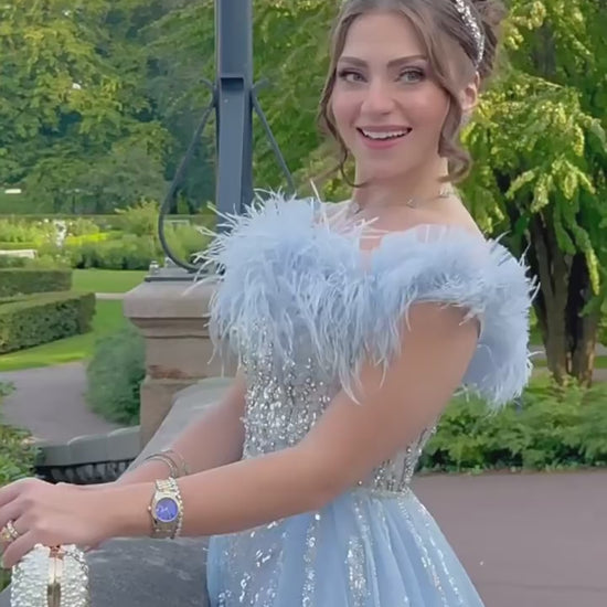 Lavender Off-the-Shoulder Feather Trim A-Line Evening Gown with Beaded Bodice & Sparkly Tulle Overskirt – 26028