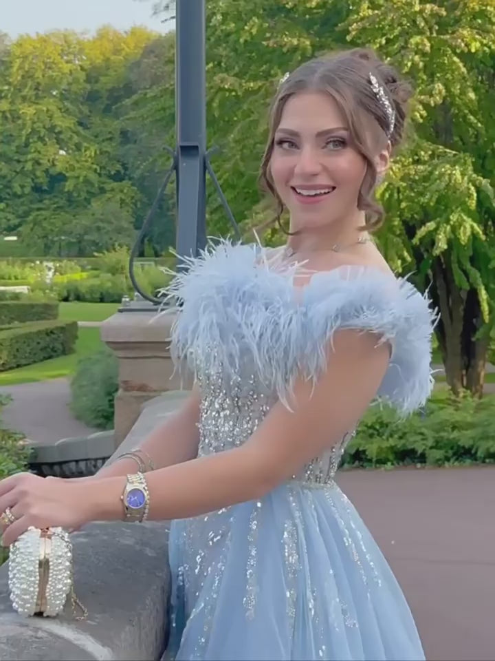 This romantic lavender evening gown features a glamorous off-the-shoulder neckline adorned with soft feather trim, creating an elegant and couture-inspired statement. The fitted bodice is richly embellished with allover crystal beading, flowing seamlessly into a shimmering illusion tulle overskirt layered over a sleek inner silhouette. Delicate sparkle patterns cascade throughout the skirt, adding movement and depth while maintaining a refined, formal look. Designed for special occasions, this gown is an exquisite choice for evening events, galas, formal celebrations, and red-carpet moments.