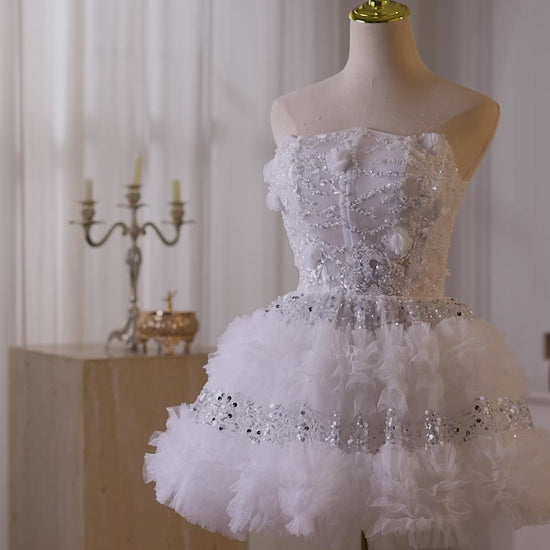 Shine like never before in this white sequin homecoming dress, designed with a radiant strapless corset bodice covered in shimmering sequins, pearls, and 3D floral appliqués. The voluminous tiered ruffle tulle skirt adds playful movement and a fairytale touch, while the adjustable lace-up back ensures a perfect fit. This breathtaking mini dress is ideal for homecoming, cocktail nights, or any special celebration.