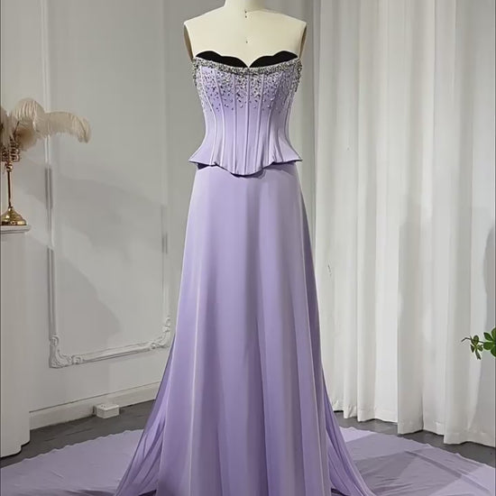 This lavender strapless evening gown features a beautifully sculpted boned corset bodice adorned with delicate crystal beading that defines the waist and enhances the silhouette. The structured sweetheart neckline adds elegance and support, while the softly draped flowing chiffon skirt creates graceful movement with every step. Designed to flatter from every angle, this gown balances modern structure with romantic softness, making it an ideal choice for formal evenings, elegant celebrations, and special occasions.