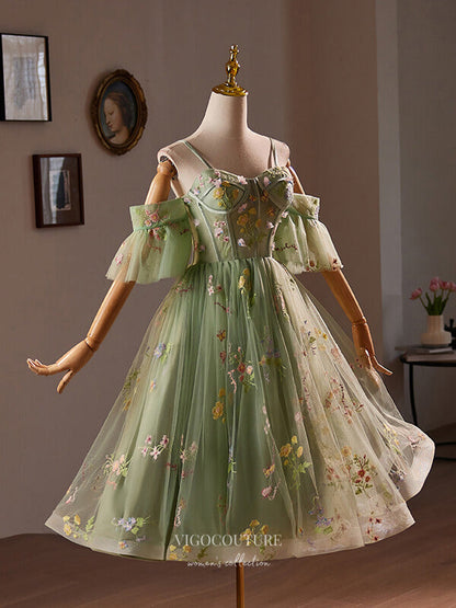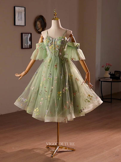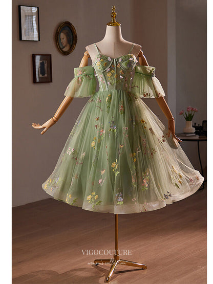 Light Green Floral Lace Applique Homecoming Dress Spaghetti Strap Tea-Length Dress hc341