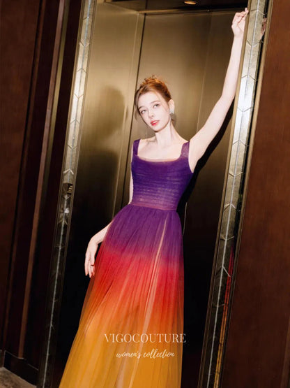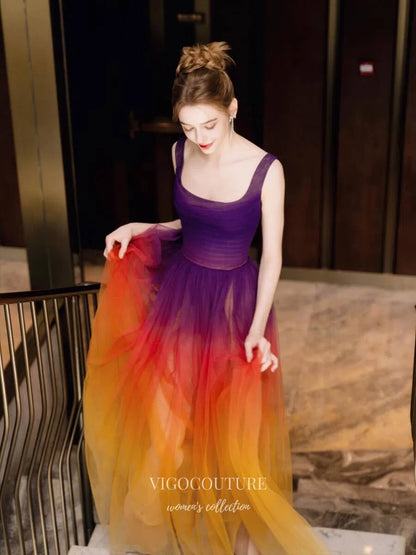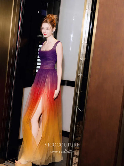 Ombre Tulle Prom Dresses 2025 with Slit Spaghetti Strap Evening Dress 25056