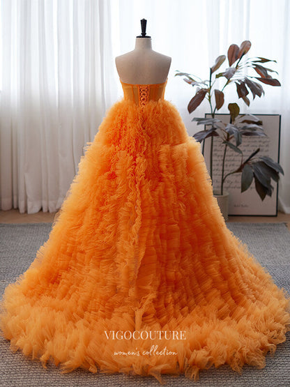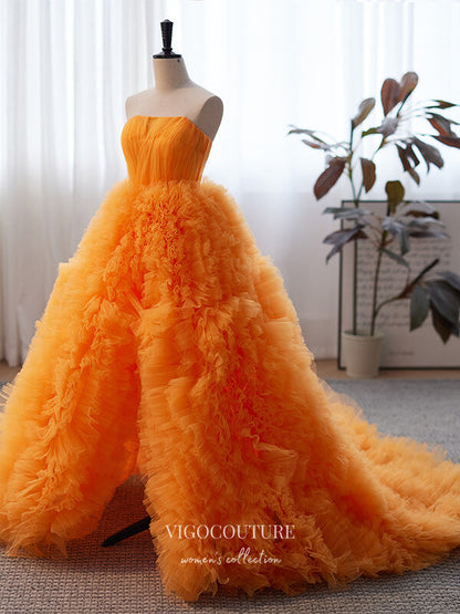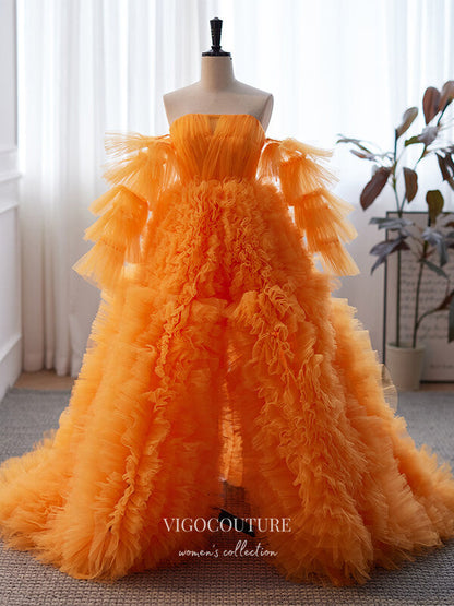 Orange Ruffled Tulle Prom Dress with Removable Sleeves and High Slit 22295