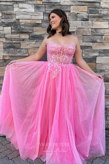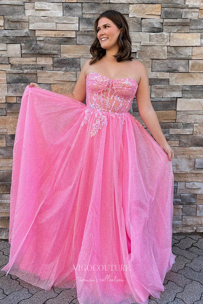 Sparkling Pink Strapless Prom Dress with Lace Applique Bodice and Slit 22194